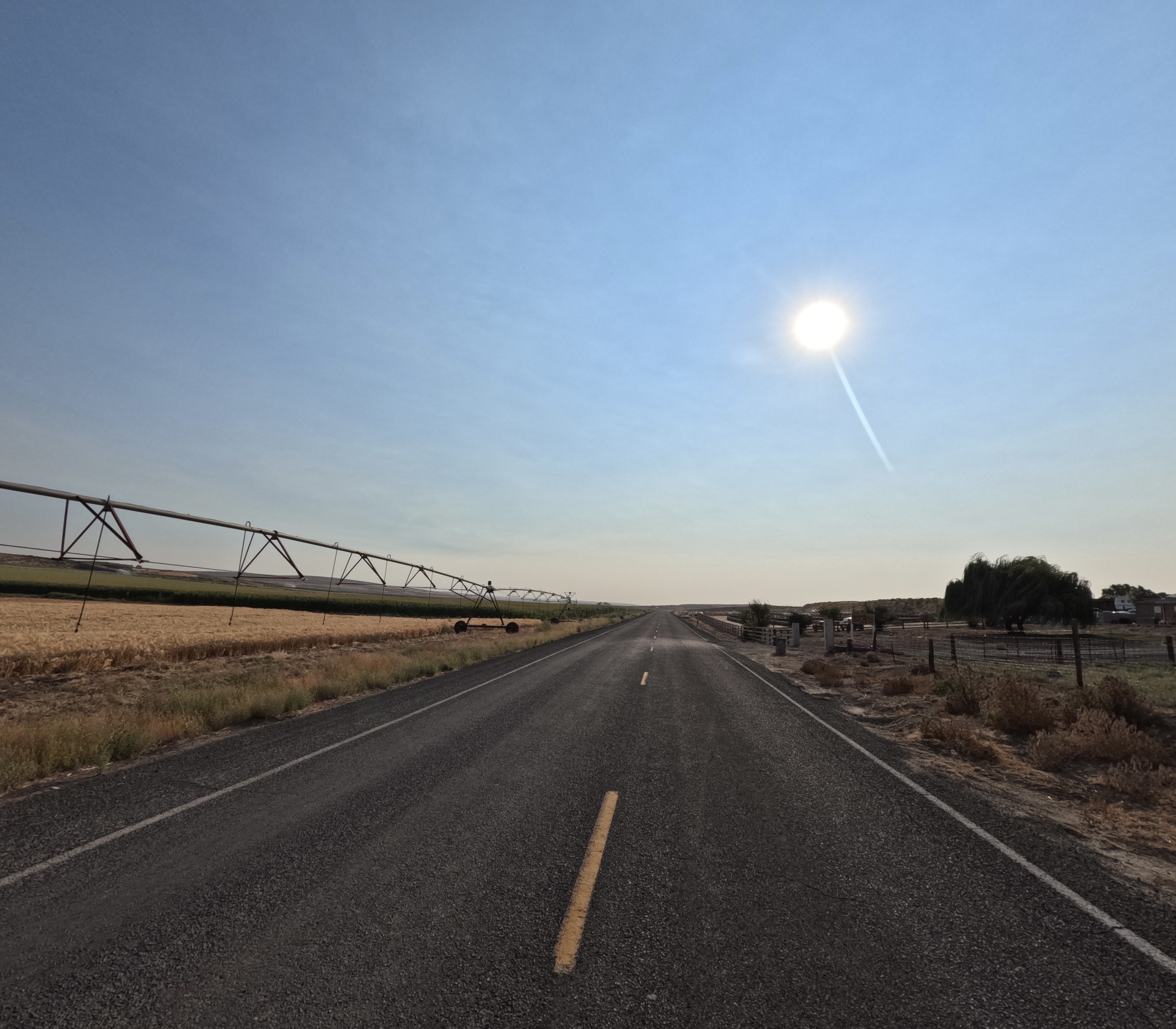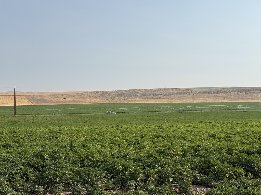 We decided to follow our contingency plan and continued to ride to Ralston and camp there. We got on the Lind-Ralston Rd, which was as smooth as Lind-Warden Rd but without rubble strips. There were hardly any traffic. Mistakenly we got off it to PTCT and paid a price. This portion of PTCT was very hard to ride because of the loose pebbles and stones. We could make only less than 5 mph. Eventually we got back to Lind-Ralston Rd. Along the sides of roads were fields of wheat, barley, corn, garlic, parsley, and others. As we approached Ralston the air quality had been improved.