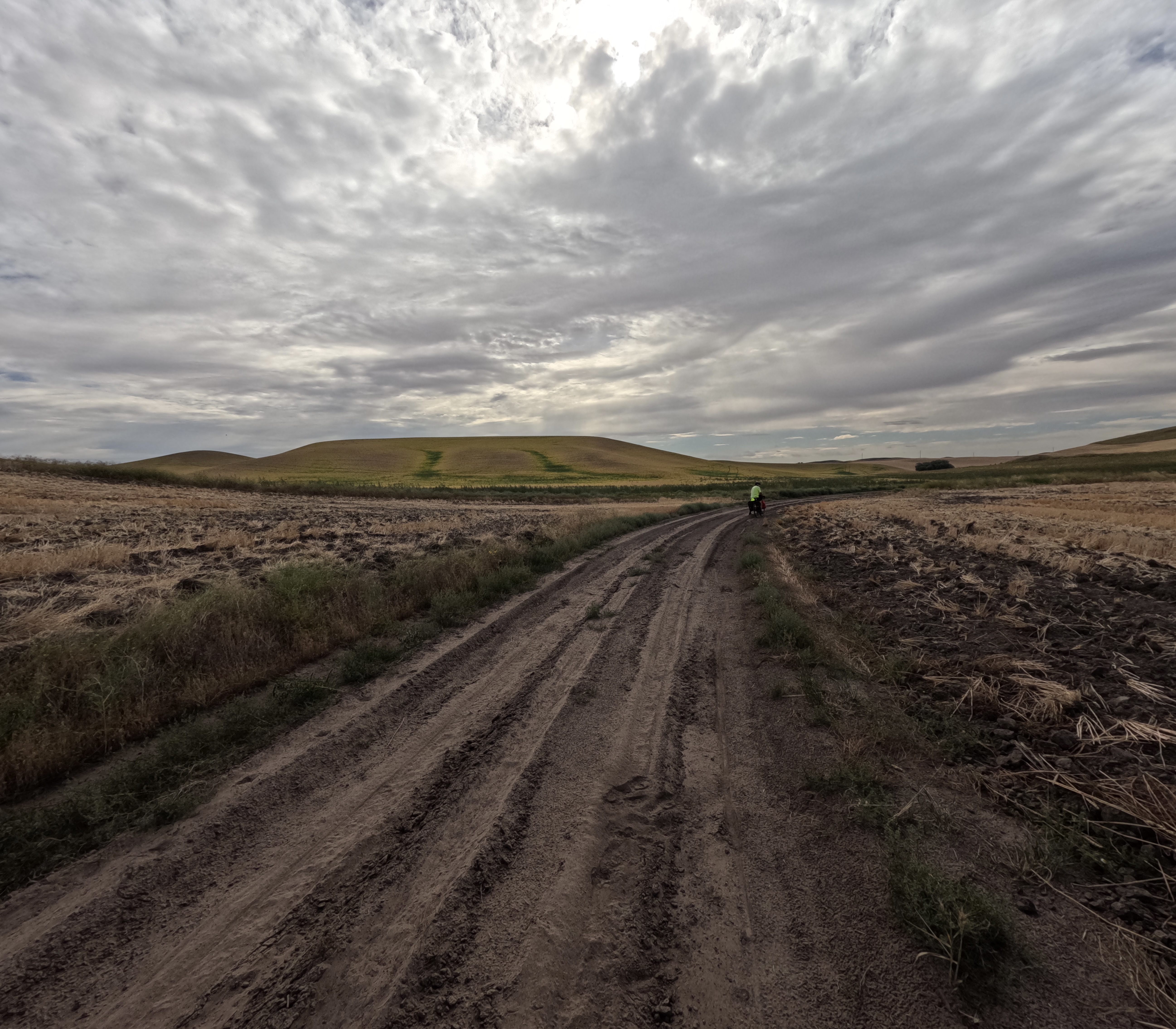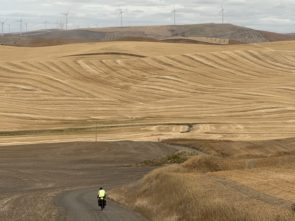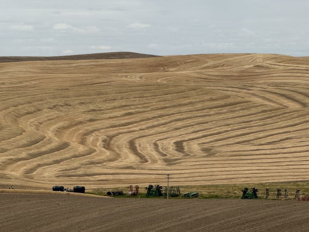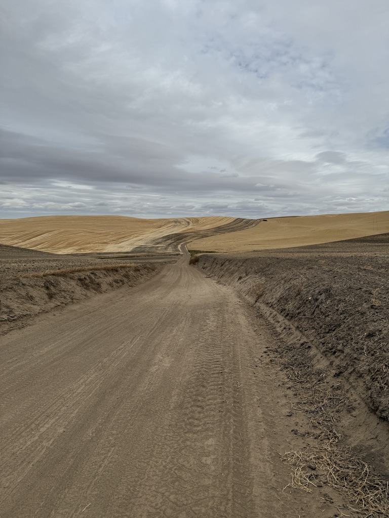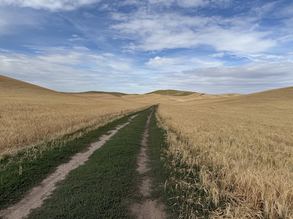 Chilly in the morning again. We rolled out of St John and soon were on unpaved roads that turned into impossible to ride with deep loose dirt. We pushed our bikes through. The roads were made for and used by heavy agricultural vehicles (combines, tractors, grain trucks). We saw them in action. We thought we were perhaps the only bikers ever who were on these roads. Scary thoughts also went through my mind: What if our bikes broke here?! Another major problem was there was nowhere we could get water when it ran out. Meanwhile, the vast wheat fields over the rolling hills were breathtaking.