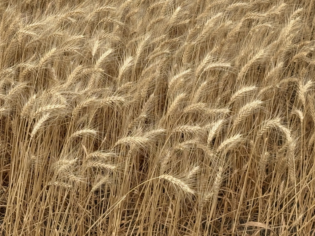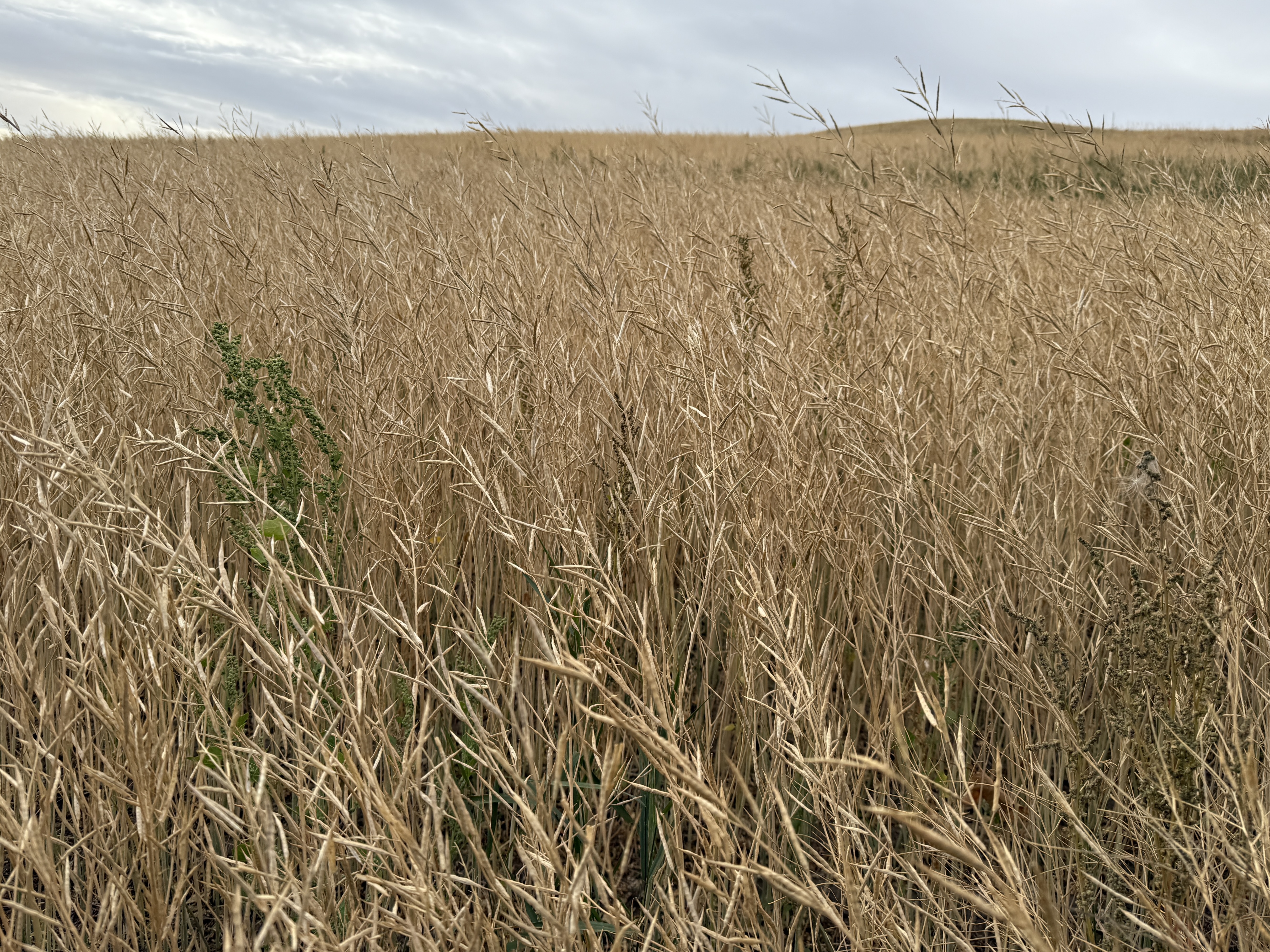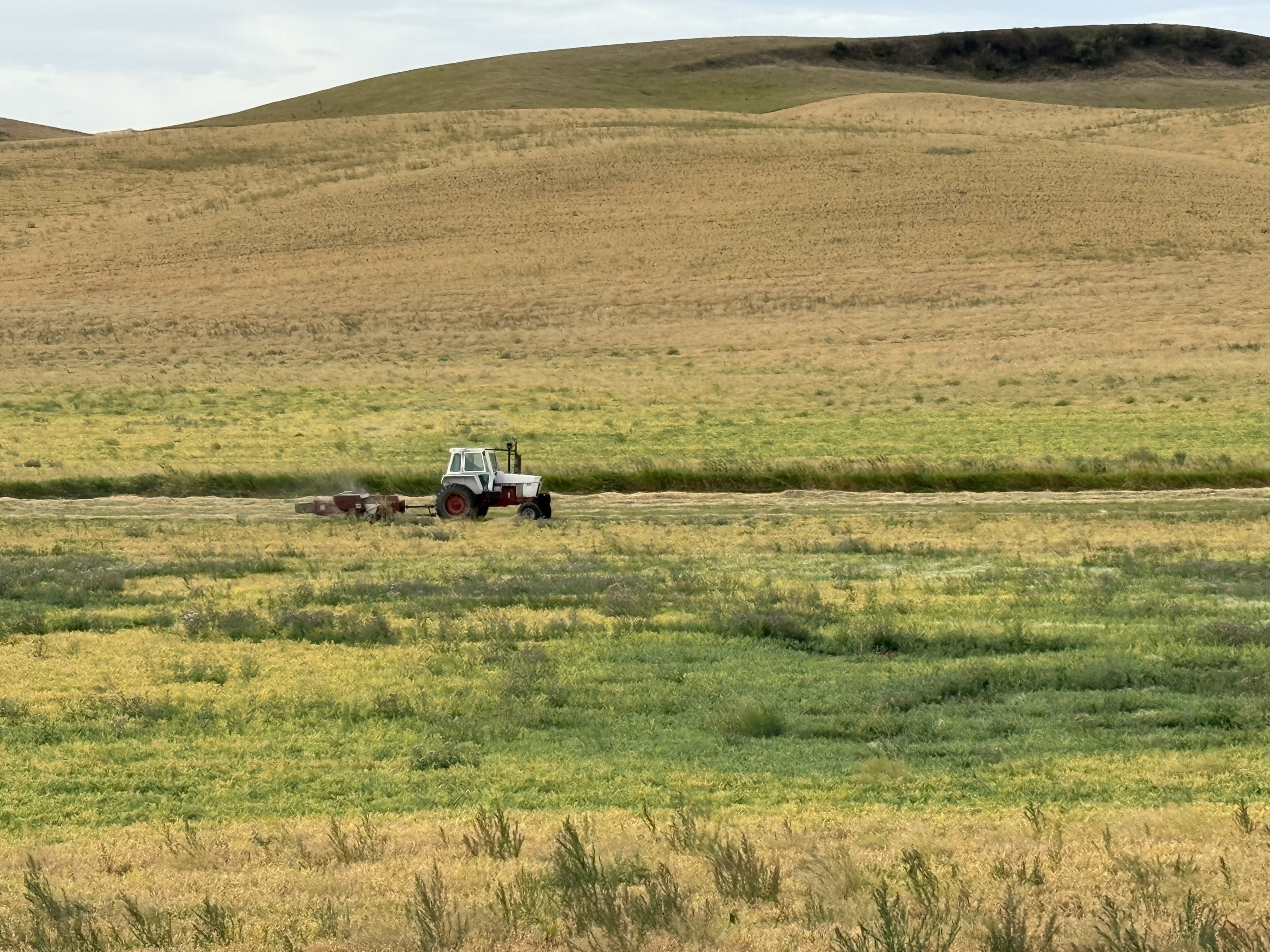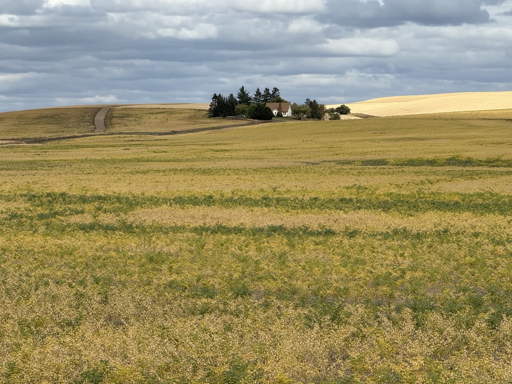 Chilly in the morning again. We rolled out of St John and soon were on unpaved roads that turned into impossible to ride with deep loose dirt. We pushed our bikes through. The roads were made for and used by heavy agricultural vehicles (combines, tractors, grain trucks). We saw them in action. We thought we were perhaps the only bikers ever who were on these roads. Scary thoughts also went through my mind: What if our bikes broke here?! Another major problem was there was nowhere we could get water when it ran out. Meanwhile, the vast wheat fields over the rolling hills were breathtaking.