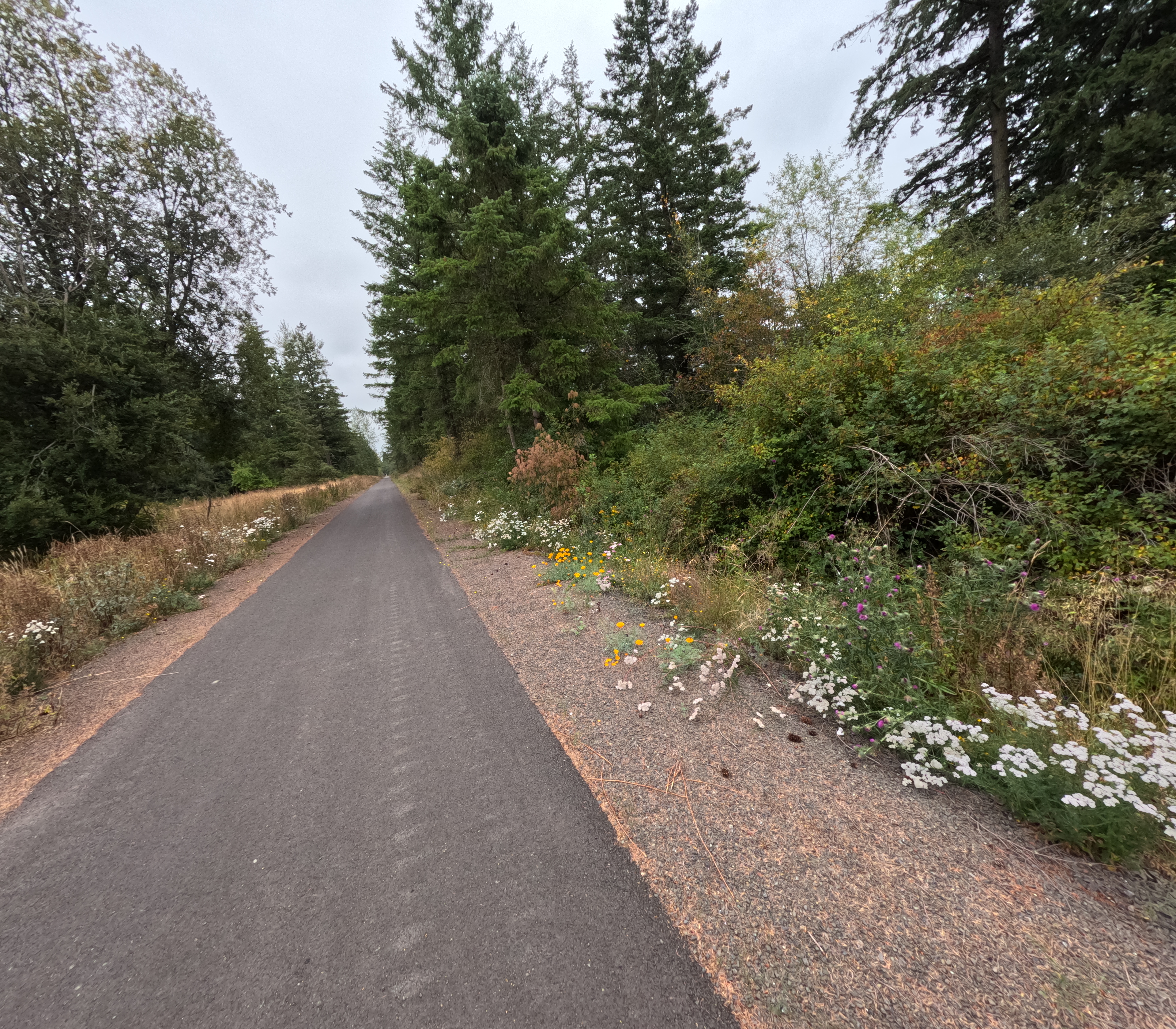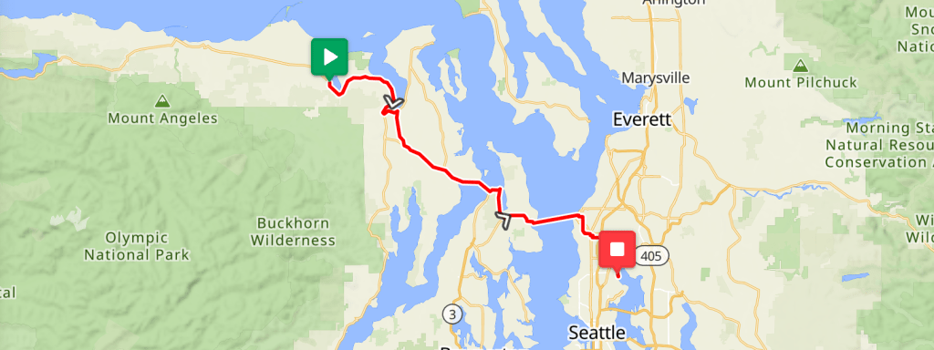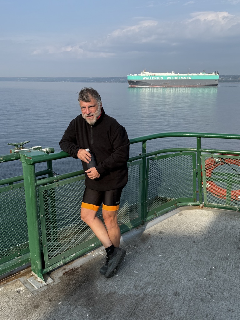 We continued on the Olympic Discovery Trail until it ended at the Discovery Bay. We switched to State Route 101 and then 20. Route 20 should have been avoided. It does not have shoulders and it curves a lot. Traffic was heavy. Some trucks passed us more closely than we wanted. Soon we were on Eaglemount Road, Old Eaglemount Road, and then Peterson Road, which were unpaved and almost unrideable. This was the first time we were challenged by gravel trails with rough surfaces that made us realize that our tires were not suitable for all gravel trails. We struggled through and reached Port Gamble and then Kinston. The Kinston-Edmonds ferry ride was pleasant and gave us a good break. But climbing out of Edmonds was tough for Peter. The reward of climbing was a long decent along NE 180th St. to the Burke-Gilman Trail which led to my house.