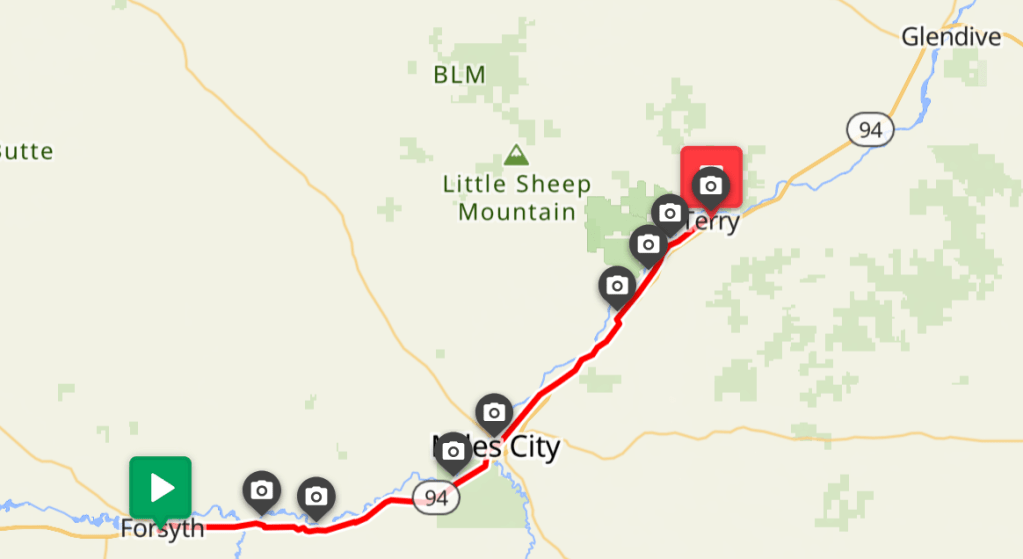 On on I-94 because of unridable local roads. Stopped at Mile City to have lunch. Then rode on Valley Dr. East to Terry.