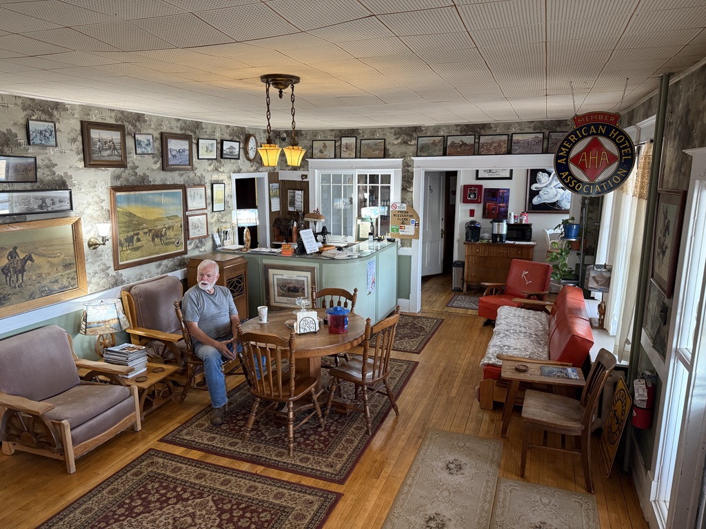 Stayed in the Kempton Motel in Terry. It was built in 1902 and had not been closed for a single day since it was opened. Roy, the owner of the motel for 39 years, is a retired civil engineer designing buildings. His book collection was in the hotel.