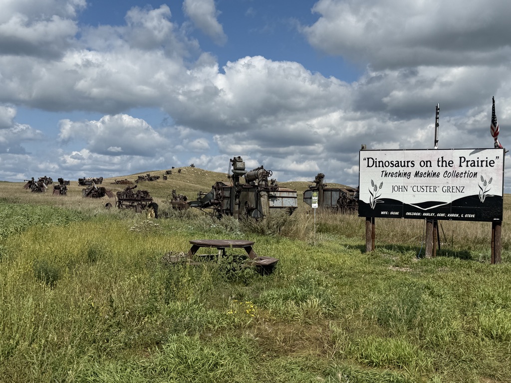The roadside yellow flowers had been a staunch scene on my ride. Rocks in farm fields would damage machines. Farmers collect them and pile them up, which makes nice contrast to the surrounding crops. The roads went through a series of lakes, which were a nice change of sceneries for me. “Minnesota must not be far” I said to myself. Someone lined up rusty threshing machines along a hill next to US 34 and call it “Dinosaurs on the Prairie”. I saw a big sign “my land, my choice”. Later I was told that oil companies lobbied the government to put underground pipelines through farmlands under the law of eminent domain. Some farmers didn’t like it.