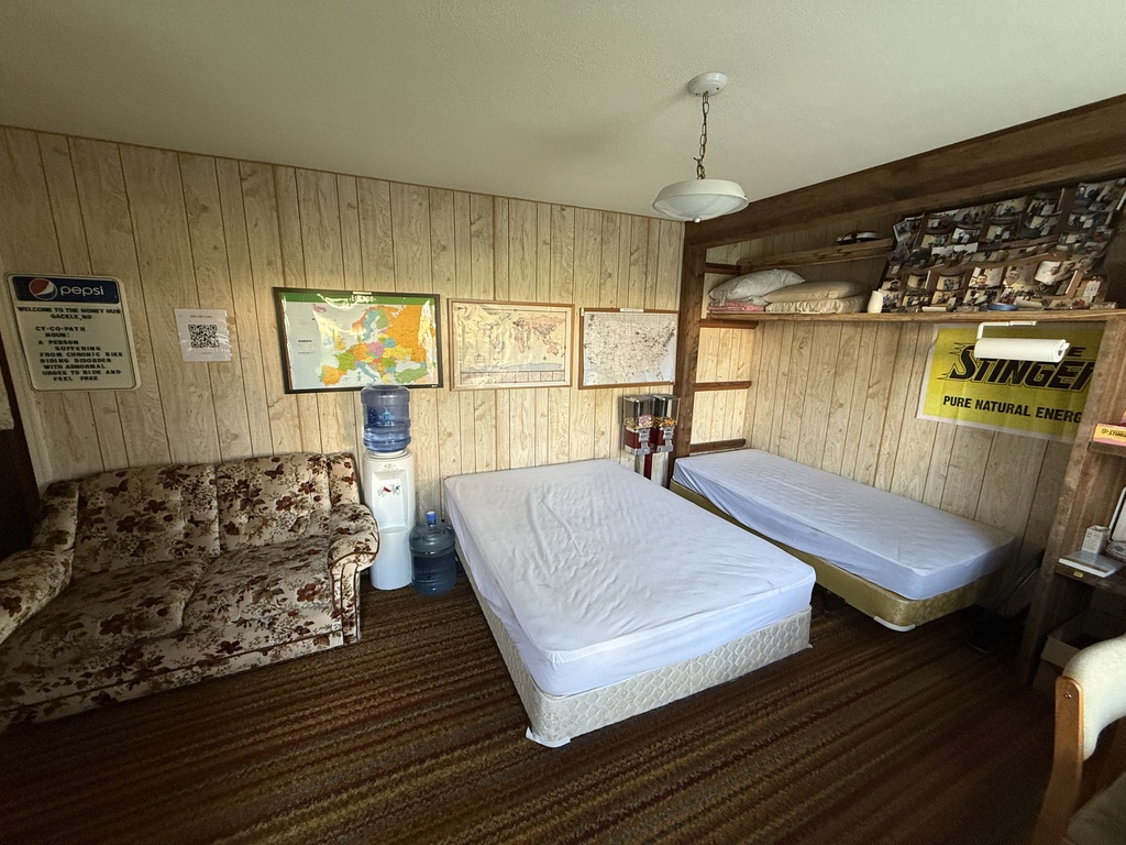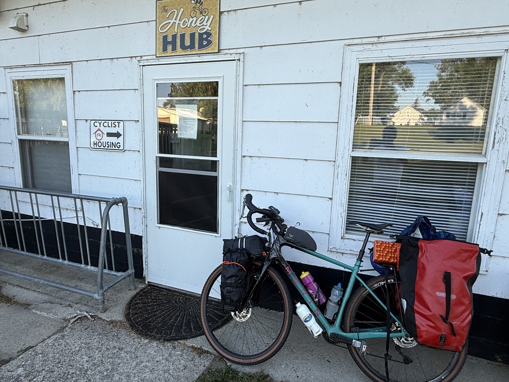 At Gackle, I stayed at the Miller Honey Hub Bike Oasis, a hostel specifically for cross-continent riders. It’s a cycling oasis because it’s in the middle of nowhere, no lodging option for 77 miles to the east. Inside, there were beds, a hot shower, a microwave, a coffee maker, energy bars, a fridge with cold drinks, apples and yogurt, and even a spare tire. No reservation needed (show up and walk in) and there was no charge! — Matthew 25:35-40 according to the welcome notes.