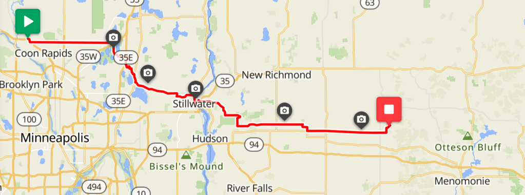 The drawbridge (actually a liftbridge) across the St Croix River from Stillwater, MN to Wisconsin is a landmark. It is only for bikers and pedestrians. Peter and I rode on the bridge, entered WI, and rode together further. We got showered on a couple of times. Later, Peter needed to stop and take a break. I continued.