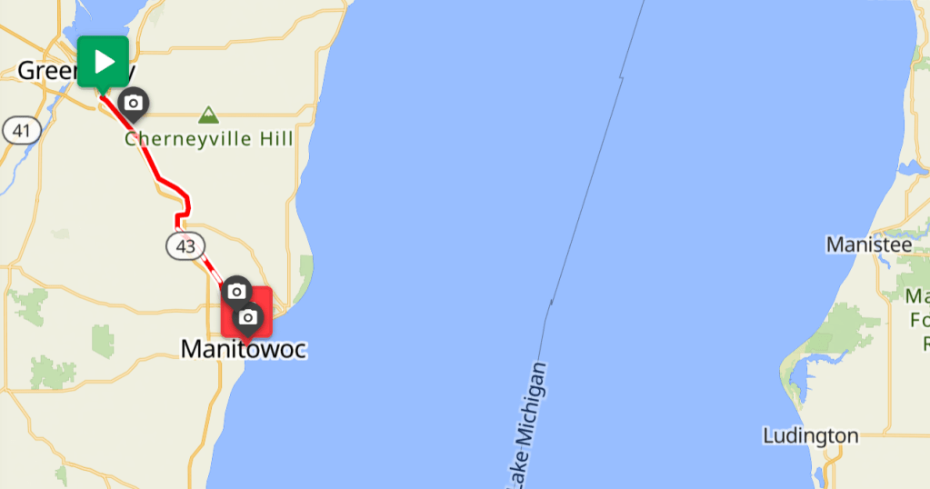 I took a ferry from Manitowoc across Lake Michigan to Ludington, MI to start the last one third of the trip. Since Billings, MT where I had my last full day of rest, I had been riding nonstop to get back in sync with the original plan. After today I’d have 15 planned riding days/segments to be covered in 20 days till the end of September. Without major issues and with 5 days reserved for rests and weather delays, I should be able to finish as planned. This was the first time after Othello, WA that I felt confident about completing the trip.