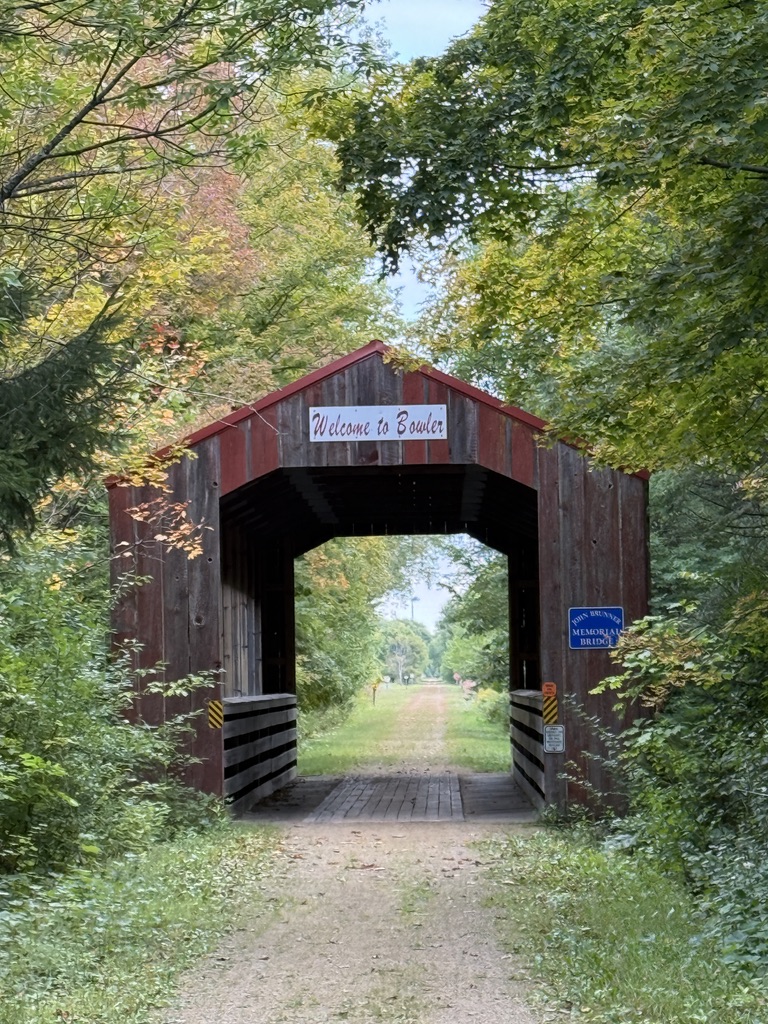 Out of Weston I was immediate on the Mountain Bay State Trail, which is a well maintain, smooth gravel 83-mile rail trail from Weston to Green Bay. It goes through forests, marshland, farmland, and many towns, big and small. Several times deer jumped on the trail in front of me and ran along the trail to show off. I was especially glad to be on a covered bridge the first time.