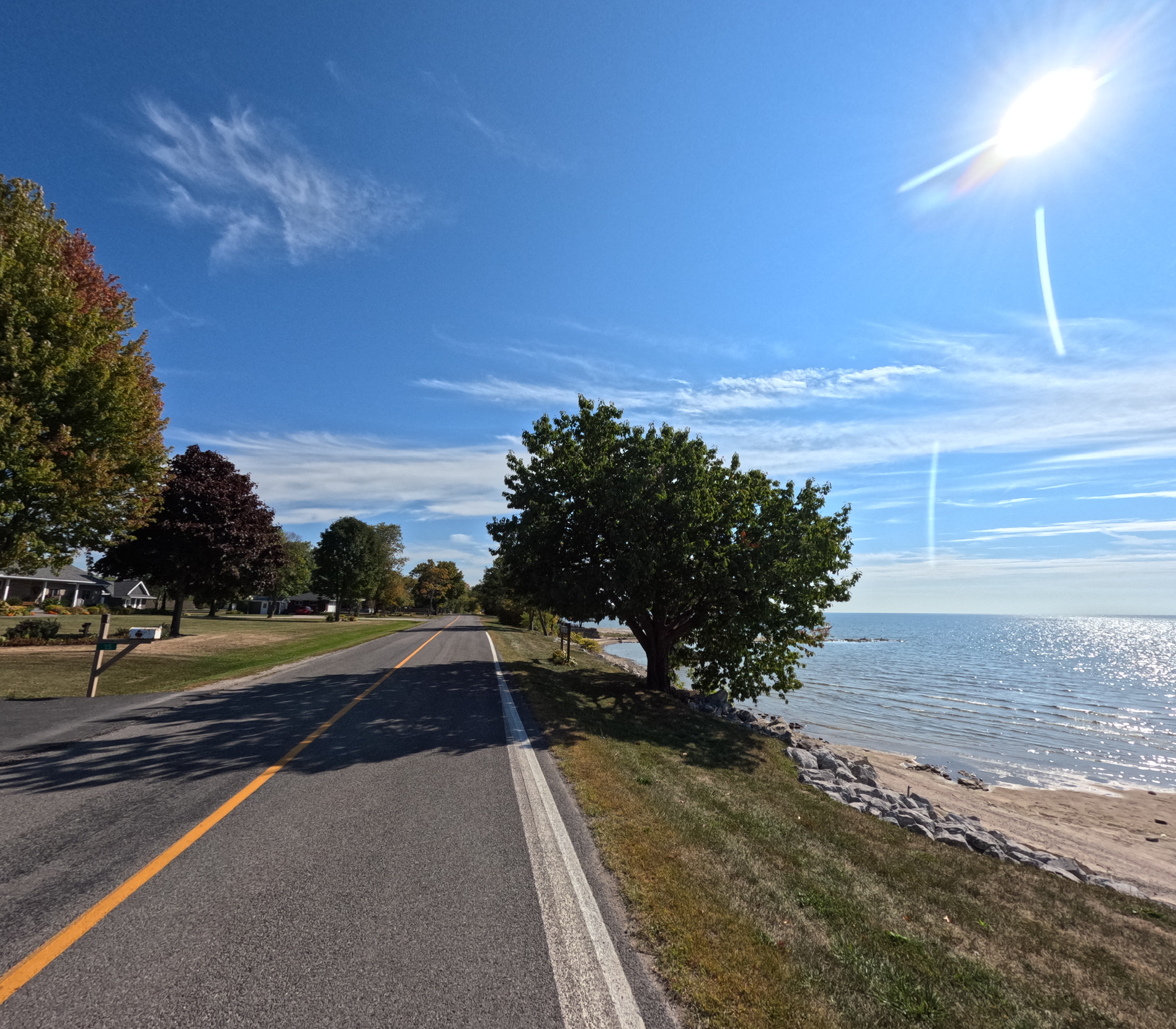 The route on last day in ON went through waterfront neighborhoods. People living by the lake are mostly retirees, some of them summer vacationers. There was no sign of water sport (e.g., kayaks, peddle boards), no decorations typical of waterfront communities (floats, anchors, propellers, captain’s wheels, big ropes). I didn’t see boats in the water. One thing I can confirm was that all Canada geese did not migrate to the US.
