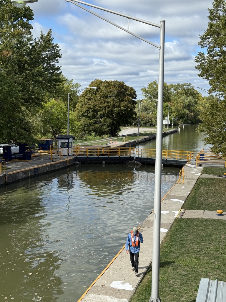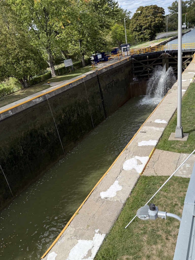 At Pittsford Lock E32, there was an observing deck where you could see the entire lock from above. The water level is in general higher toward the west. So a lock would lower the water to let boats in from the east and raise it to let them out to the west.