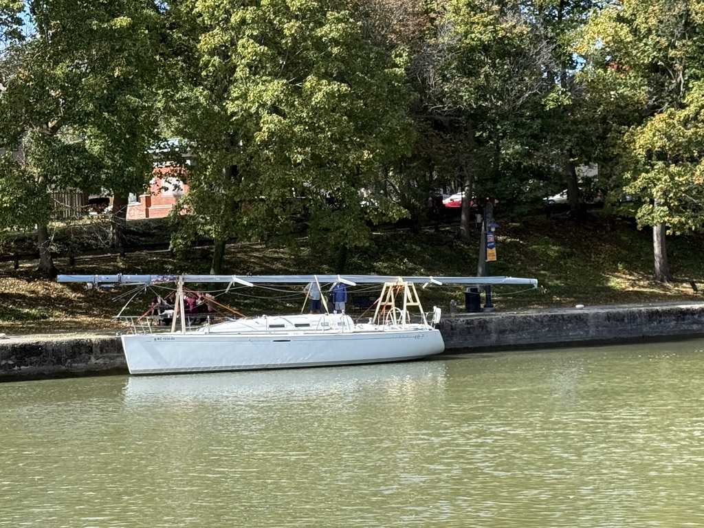 The fixed and lift bridges have limited height clearance that would not allow any sailboats to pass without their masts taken down. There are business at each end of the canal that help sailboat owners to do just that at the beginning of their canal trips and raise their masts up again at the end.